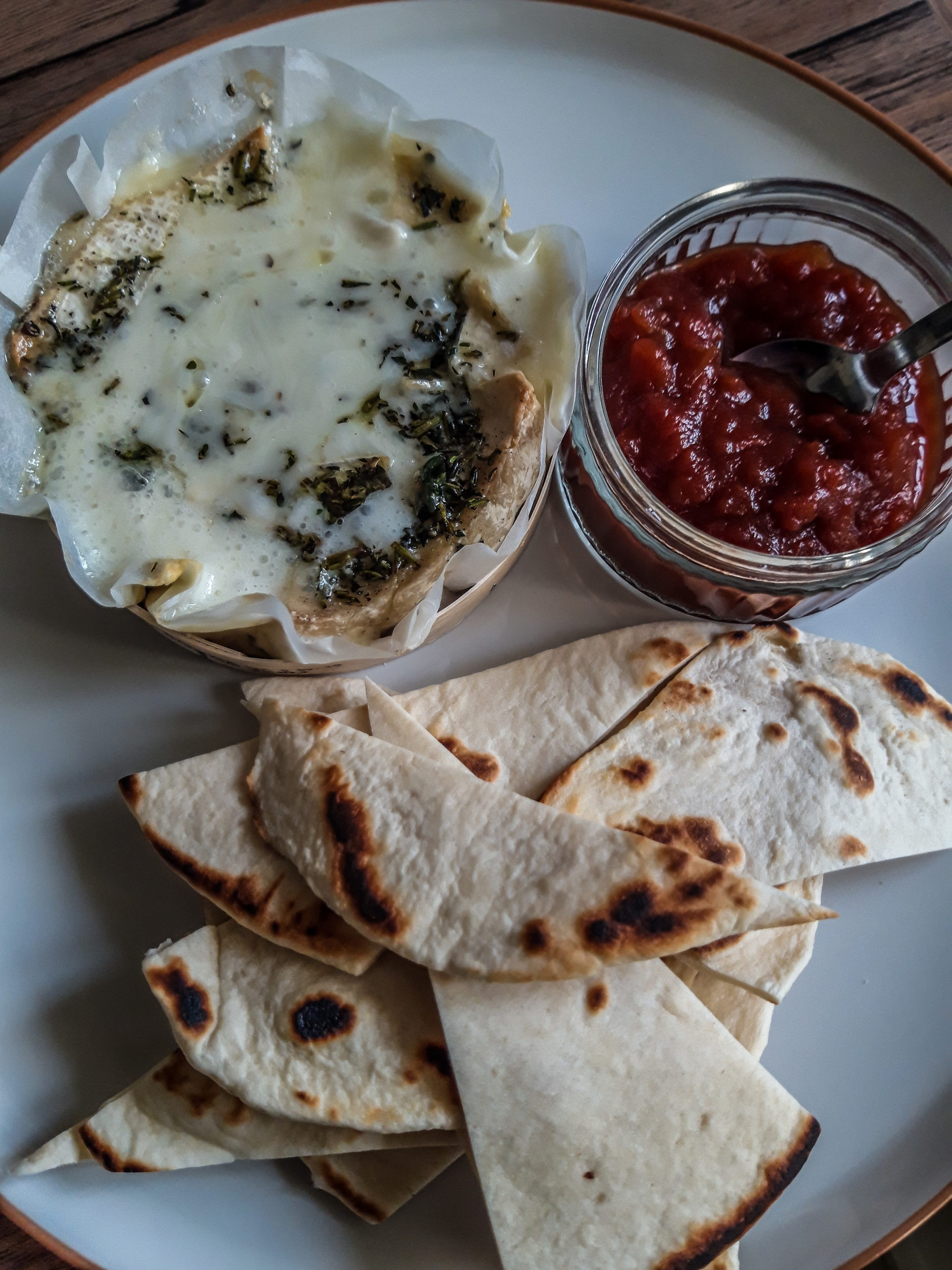 I have teamed my flatbread and baked Wigmore with a gorgeously sweet tomato and onion marmalade. Enjoy!